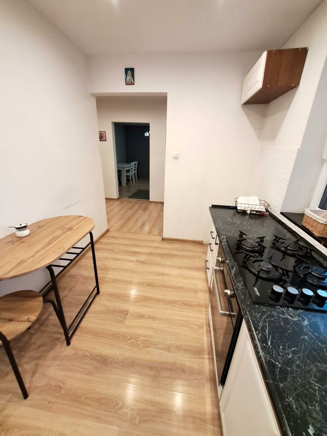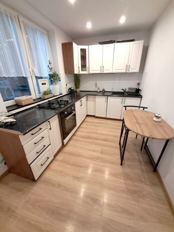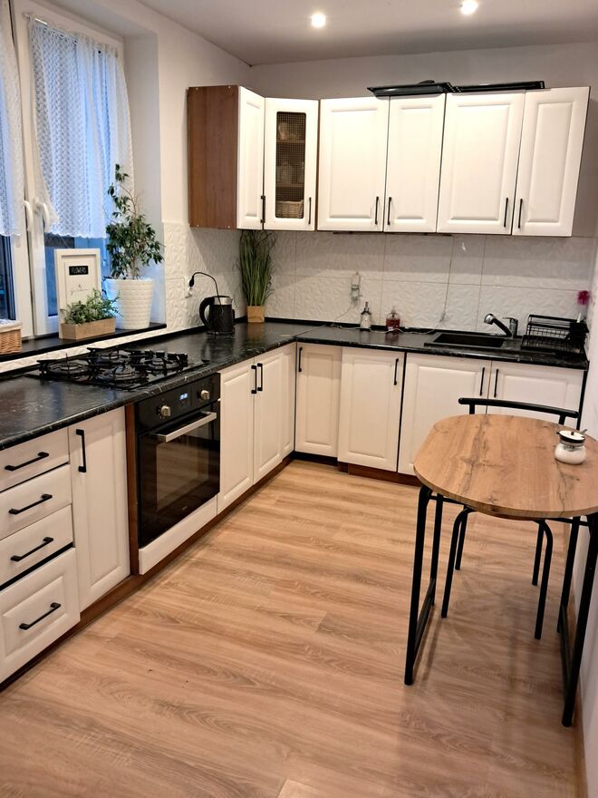 Kuchnia wyposażona w meble kuchenne, płytę gazową (gaz butlowy) wraz z piekarnikiem do zabudowy.